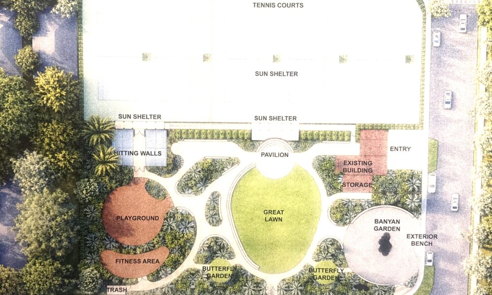 The proposed plan for Kirk Munroe Park, perhaps best known for its tennis center at Oak Avenue and Matilda Street, incorporates several new features, including butterfly gardens, sun shelters and a garden surrounding the park’s old-growth banyan tree.