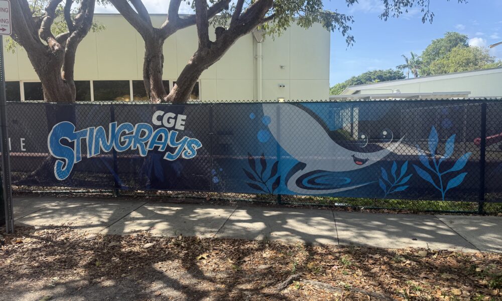 The smiling stingray is a part of a new fence cover that lines the back perimeter of Coconut Grove Elementary School – much to the chagrin of neighbors who border the school property.