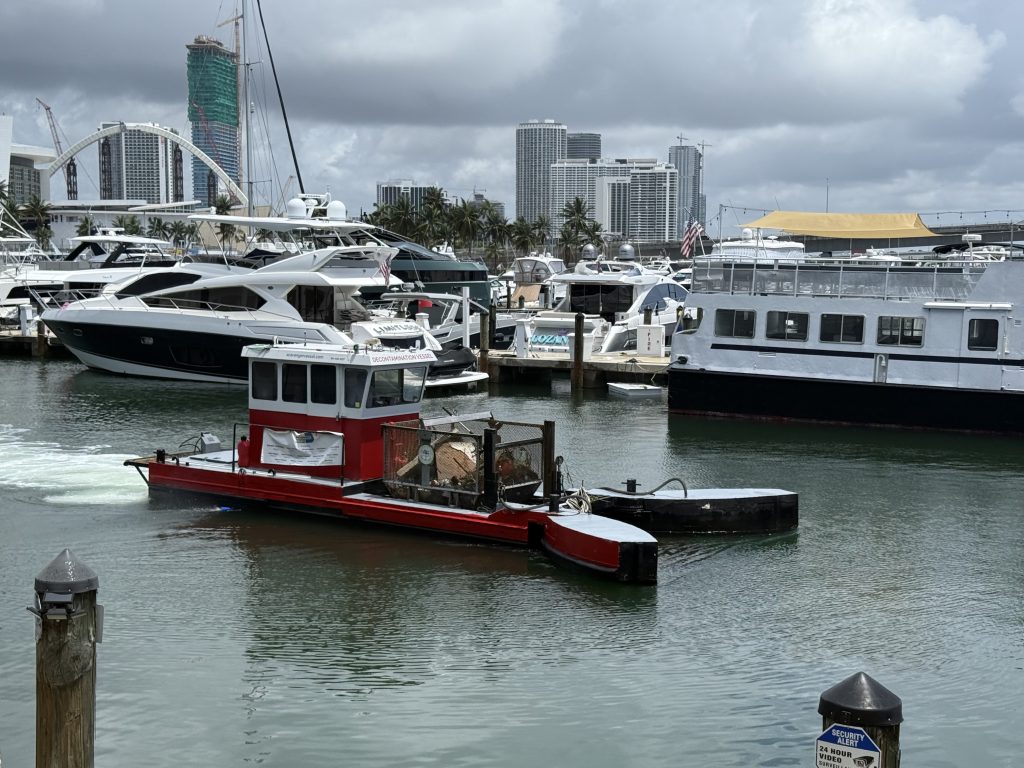 The Scavenger 2000 marine vessel travels the length of Miami’s coastline, collecting debris, killing harmful bacteria and pumping oxygen into bay waters.