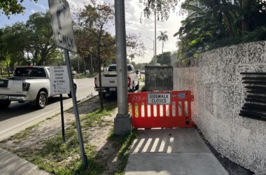 Residents say sidewalks near the Four Seasons Private Residences construction site have been closed for nearly two years, forcing pedestrians into traffic along South Bayshore Drive and raising questions about safety and the appropriation of public rights-of-way.